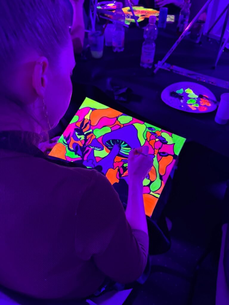 Bei Techno & Paint geht es darum, gemeinsam eine richtig gute Zeit zu haben: anstoßen, feiern, kreativ sein – alles in einer lockeren, energiegeladenen Atmosphäre mit guten Beats und Schwarzlicht.