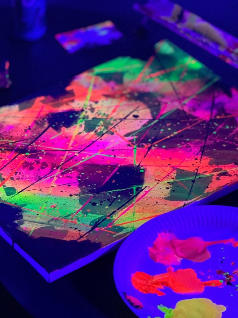 Tauche ein in eine magische Atmosphäre aus Schwarzlicht, Musik und leuchtender Farbe. In entspannter Stimmung, mit einem Drink in der Hand, entsteht dein ganz persönliches Kunstwerk auf einer 30×40 cm Leinwand.